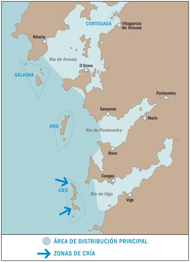 Aniña no Parque Nacional dende 2007. Actualmente a poboación hai de superar as 20 parellas reprodutoras, espalladas pola illa de Monteagudo e San Martiño (Cíes). De costumes nocturnas cando se achega a terra, adoita aniñar en tobos baixo rochas e penedos.